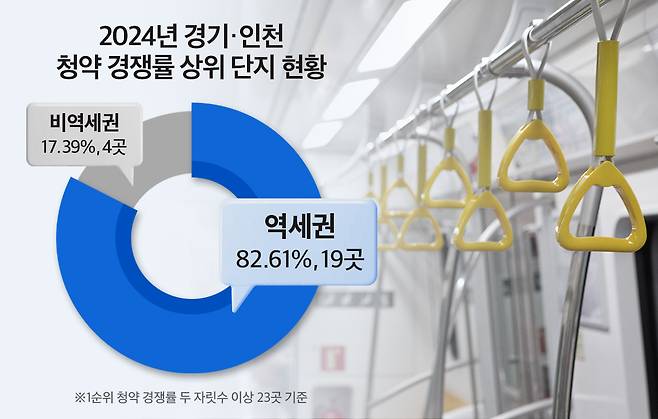 부동산정보업체 부동산인포가 2024년 경기, 인천 분양 단지를 확인한 결과, 1순위 경쟁률 두 자릿수 이상을 기록한 단지는 총 23곳이었고, 이 중 19곳이 역세권 단지로 나타났습니다. 청약 성적이 좋았던 곳 중 82.61%를 역세권(예정 포함)이 차지한 것입니다.
