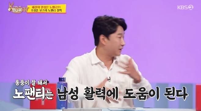 이를 들은 김희철은 이천수와 추성훈이 평소에 노팬티를 추구한다고 말해 눈길을 끌었는데요. 추성훈은 “패션을 좋아하는 사람이라면 팬티 라인이 드러나는 게 싫다. 남자라면 엉덩이가 예뻐야 한다”고 설명했고, 이천수 또한 “지금은 입고 있는데 노팬티가 정력에 좋다는 얘기가 있다. 좋다고 해서 안 입어봤는데 진짜 괜찮더라”라고 덧붙였습니다.
