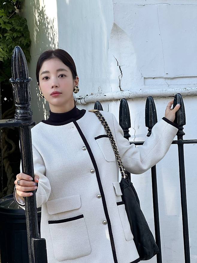 화사한 아이보리 컬러의 배색 트위드 자켓에는
