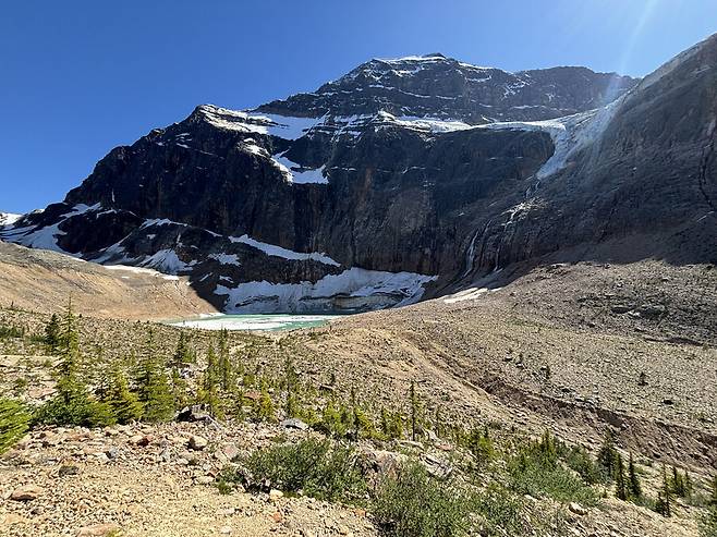 사진 산 가운데 물이 내려오는 것처럼 보이는 곳이 빙하인데