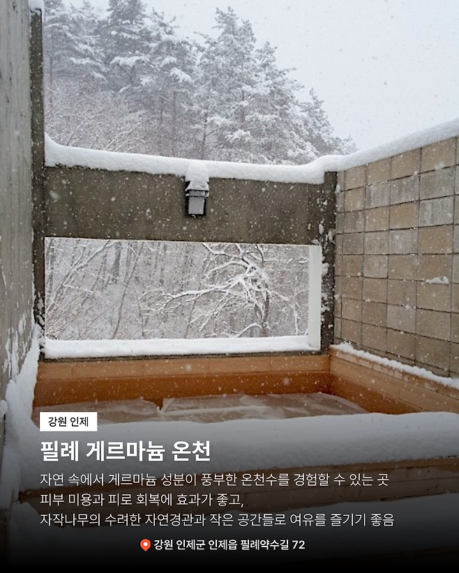 규모는 작지만 온천수 품질이 뛰어나며, 게르마늄 함량이 높아 물빛이 갈색을 띠는 것이 특징입니다. 아름다운 자작나무 숲을 조망하는 노천탕에서 #뷰맛집 으로 손꼽히는 풍경을 감상하며 진정한 힐링을 선사합니다. 아주 작은 동네 목욕탕 수준의 소박한 규모지만, 온천수의 효능만큼은 최고라는 평가를 받습니다.