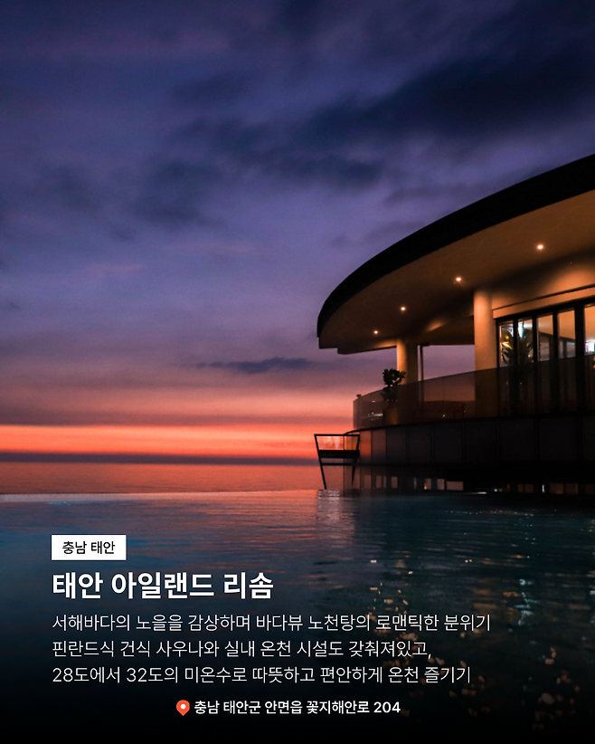 메마른 일상 속 오아시스 같은 시원한 휴식처인 오아식스 선셋스파는 꽃지해변의 노을을 완벽하게 감상할 수 있는 최적의 장소입니다. 야외 인피니티풀을 포함한 6가지 테마스파 전 시설에는 지하 420m 암반수가 공급되며, 꽃지 바다 수평선과 맞닿은 듯 이어진 인피니티풀에서 몽환적인 인생샷을 남길 수 있습니다. 28도에서 32도의 미온수가 유지되어 외부 기온에 상관없이 따뜻하고 편안하게 즐길 수 있으며, 어린이와 보호자가 안전하게 즐길 수 있는 키즈 시설도 마련되어 있어 온 가족이 함께 로맨틱한 바다 노을과 스파를 만끽할 수 있습니다.