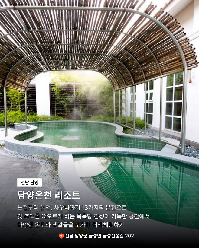 여러 온천수와 이벤트탕으로 온천욕과 함께 휴식을 취할 수 있으며, 담양리조트 온천은 2025년 12월 31일까지 네이버 예약 시 할인된 가격으로 이용 가능합니다. 광주대구고속도로 담양IC에서 가깝고, 광주, 정읍 여행 후 연계하여 방문할 수 있습니다.