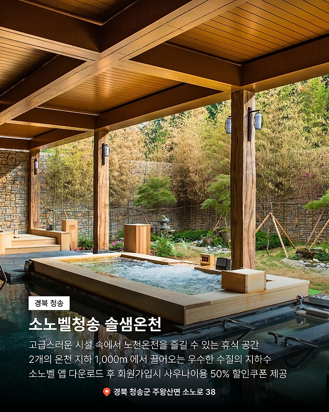지하 1,000m에서 1일 총 570톤의 풍부한 온천수를 공급하며, 황산염, 칼슘 등 다량 함유된 약알칼리성 귀한 수질의 온천탕을 즐길 수 있습니다. 노천탕에는 대나무 정원과 히노끼노천탕 등 알찬 구성으로 깔끔하게 관리되어 있으며, 사우나 시설도 완비되어 있습니다. 샤워 후 사과 자판기 같은 이색 편의 시설도 인상 깊으며, 주왕산과 주변 맛집이 많아 준비 없이 방문해도 좋고, 부모님과 아이들을 동반한 가족 여행으로 특히 좋습니다.
