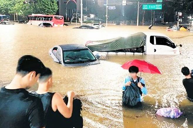 특히 이번 중부지방 집중호우는 지대가 상대적으로 낮고 배수시설이 미비한 서울 강남 일대를 그야말로 초토화시켰는데, 강남역 인근에는 11년 만에 도로와 인도에 빗물이 가득 차 차량이 침수되었다.