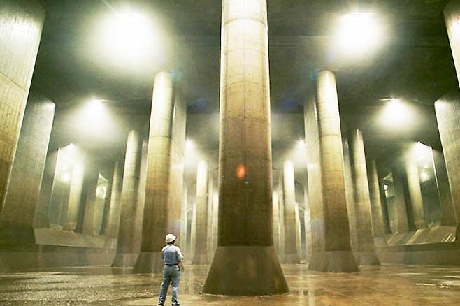 마치 좀비 영화 촬영장을 연상케하는 이 지하 신전은 1992년 짓기 시작해 2006년 완공된 이 초대형 방수로는 설치된 뒤 장마와 태풍으로부터 일본 도쿄 및 수도권 지역을 지켜주고 있다.
