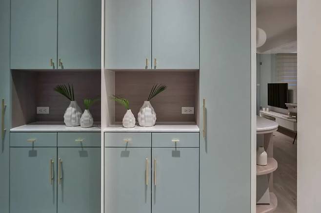 좁은 현관 구조에도 불구하고, 집주인의 공간은 그레이톤 거울과 테라조 벽면의 조화를 통해 시각적 흐름을 유도합니다. 시선을 따라가면 자연스럽게 등장하는 녹색 수납장이 공간의 중심을 확고히 잡고 있습니다. 우아함과 동시에 강한 존재감이 곳곳에 퍼져 있으며, 부드러운 여성스러움이 은은하게 감돕니다.