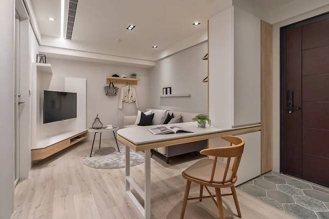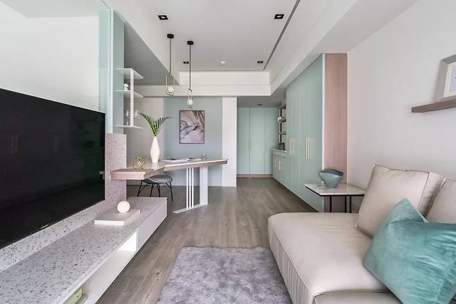 조카의 거실은 시야를 넓히기 위해 TV장을 비스듬히 배치했습니다. 이 독특한 각도는 시청의 편리함을 넘어 공간의 선을 이끌며 입체감을 더합니다. 또한 벽면을 따라 설치된 행잉 오브제는 시선을 위아래로 자연스럽게 유도합니다.