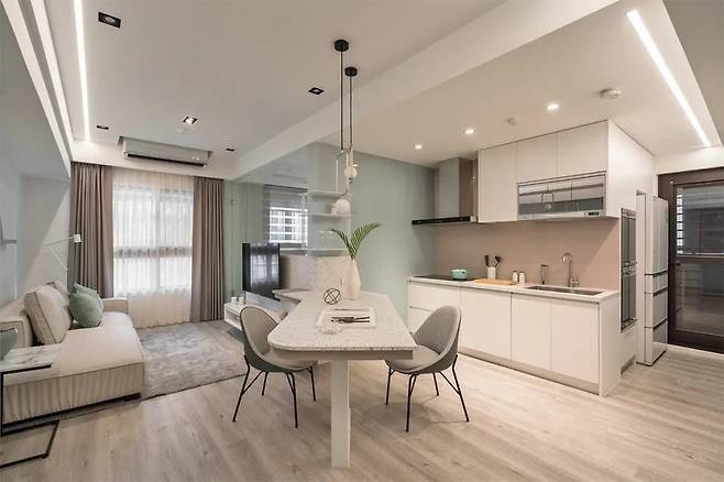 주방은 다이닝과 조리 구역이 명확히 구분되면서도 연결감을 잃지 않습니다. 대표적인 예로 실버폭스 대리석으로 마감된 일자형 아일랜드가 있습니다. 이곳은 캐주얼한 식사와 티타임, 손님 접대까지 다양한 기능을 소화합니다.