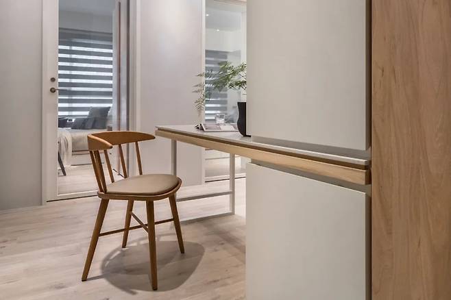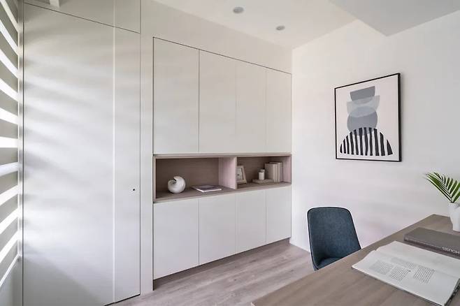 서재는 침실과 이어져 있지만, 순백의 벽면과 무게감 있는 우드 텍스처의 책상이 분리감을 줍니다.
