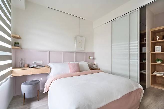 침실은 은은한 회갈색과 연한 핑크 빛이 어우러진 벽면과 은폐형 슬라이딩 도어로 시작됩니다. 도어를 열면 드레스룸이 이어지며, 조도가 낮아 하루의 피로를 풀어주는 휴식 공간을 제공합니다.
