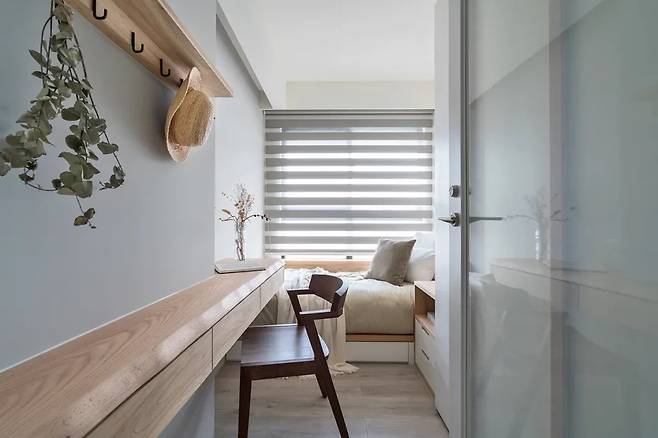 조카의 침실은 실용성에 중점을 두었습니다. 침대 하부에는 서랍장이 숨겨져 있어 큰 수납이 가능하며, 투명 유리 도어로 마감된 옷장은 개방감을 줍니다. 벽면은 조카가 좋아하는 원목 프레임 장식으로 독특하게 꾸며졌습니다.