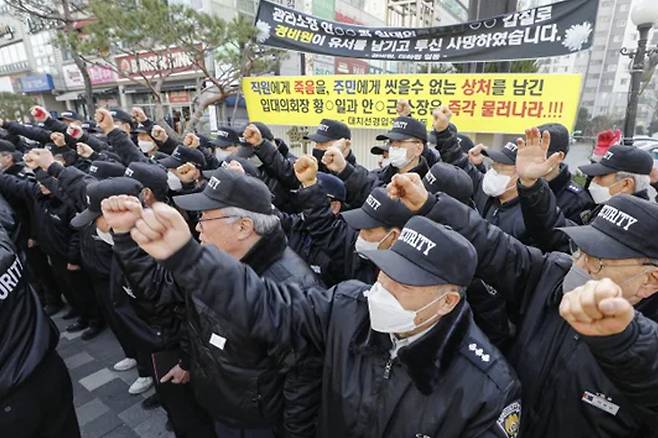 여기에 경비원의 경우 3개월 등 초단기로 간접 고용되는 불안한 고용 구조를 갖추고 있다. 경비원 5명 중 1명이 3개월마다 갱신되는 근로계약을 맺고, 5명 중 4명은 아파트에 직접 고용되지 않는 실정이다.