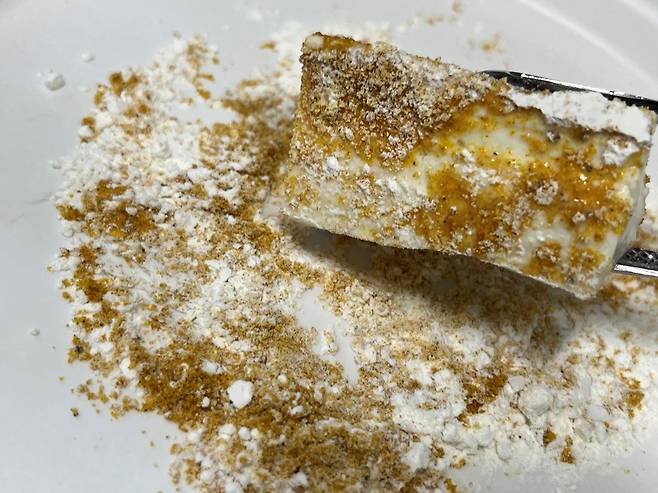 부침가루와 카레가루를 1:1 비율로 섞습니다. 카레를 묻혀 두부를 구우면 은은한 카레 향이 더해져 두부 특유의 밋밋함이 사라지고 감칠맛이 살아납니다.
