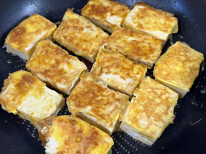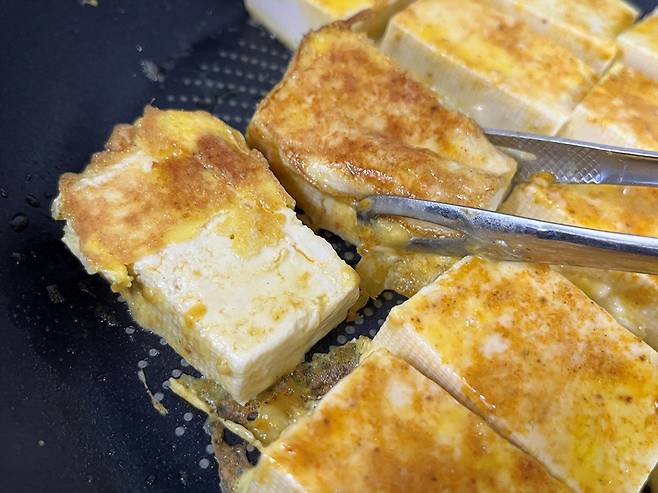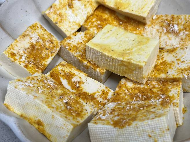평소 두부맛이 너무 심심해서 두부를 잘 안 드시는 분들도 계실 텐데요. 카레가루와 부침가루를 섞어 입힌 뒤 구워 보세요. 은은한 카레 향이 더해져 밋밋함은 사라지고 훨씬 맛있는 요리가 됩니다.