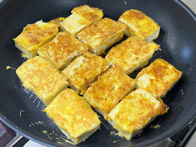 기름을 두르고 이제 계란물 입힌 두부를 굽습니다. 두부는 너무 약한 불에서 굽기보다는 중 약불 또는 중불에서 구우세요. 그래야 겉이 바삭하고 고소하게 구워집니다.