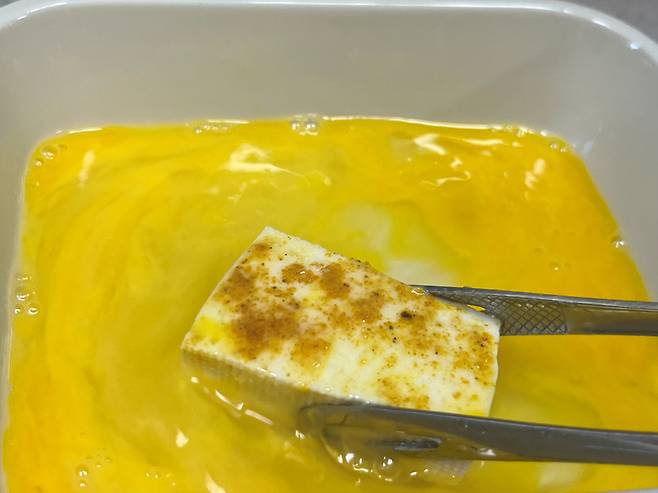계란 1개를 풀어 두부에 계란물을 입혀 주세요. 두부 300g 기준, 계란 1개면 충분합니다.