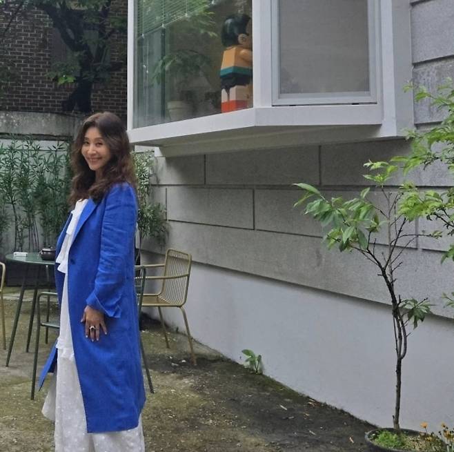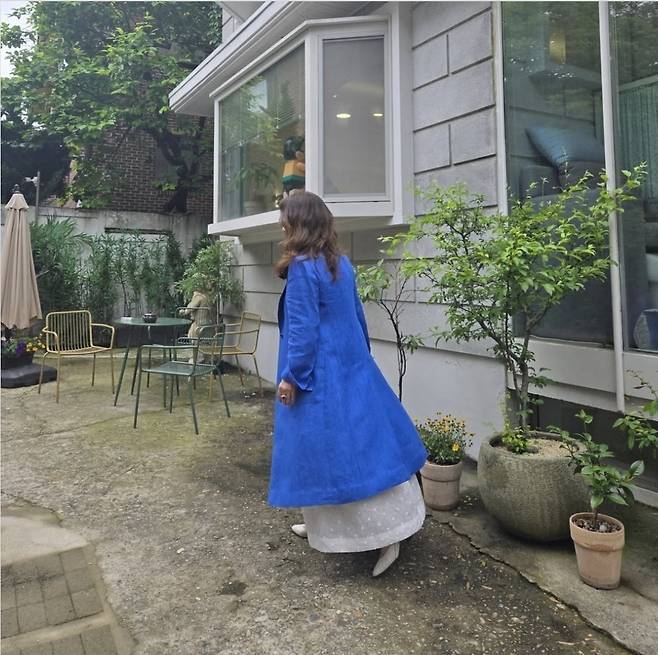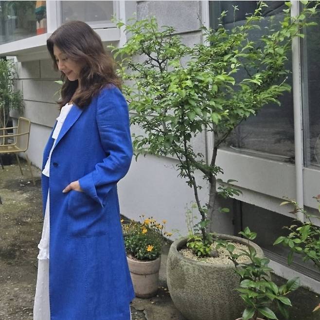 최명길은 가족 모임 자리에서 청명한 블루 롱코트를 중심으로 한 클래식 하면서도 우아한 룩을 선보이며 단아한 기품을 물씬 풍겼습니다.