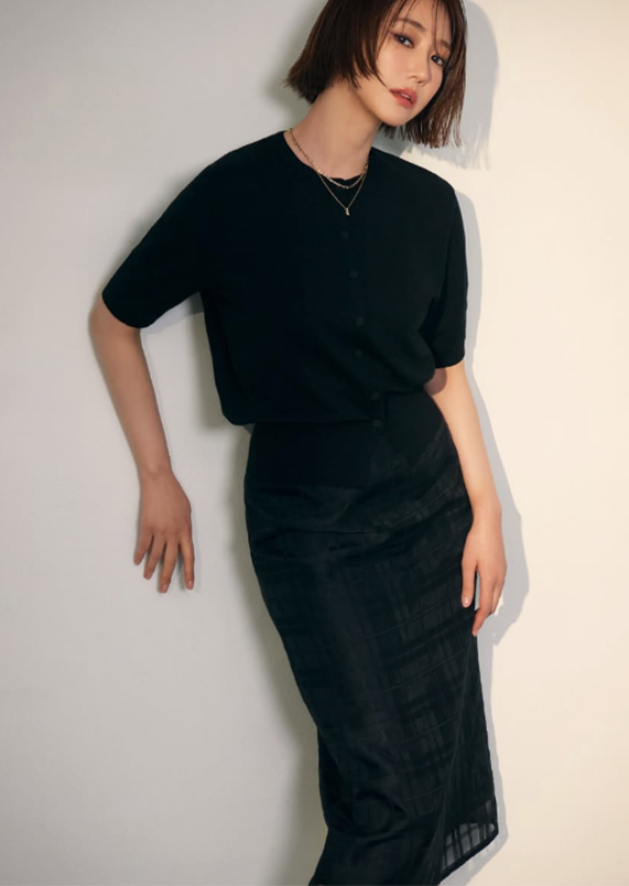 여기에 스커트는 체크 패턴이 은은하게 가미된 시스루 소재로 스타일에 변주를 더했으며, 계절감을 고려한 원단 선택이 돋보인다.