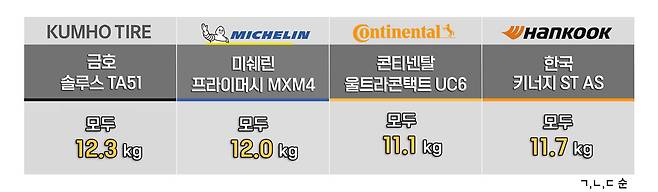 무게 측정 결과 콘티넨탈이 11.1kg으로 가장 가벼웠다. 다음은 한국, 미쉐린, 금호 순이다. 무게가 가벼워지면 자동차의 순발력 및 가속력에 이점이 생기며 미미하게나마 연비를 높이는 데 도 도움이 된다.