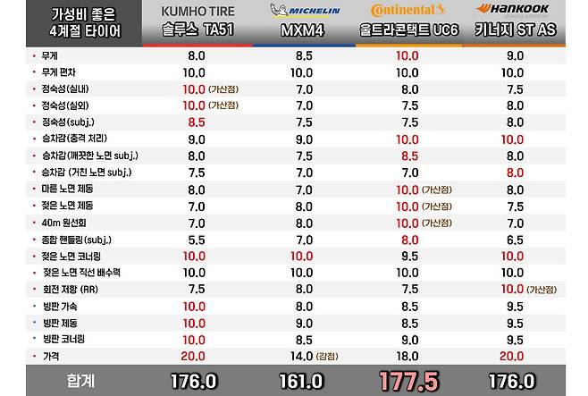 결론적으로 금호와 한국이 동일한 점수를 득했고, 다음 콘티넨탈, 미쉐린 순으로 점수를 챙겼는데, 미쉐린은 가격이 높아 감점(최고 점수의 10%인 2점)을 받았다.
