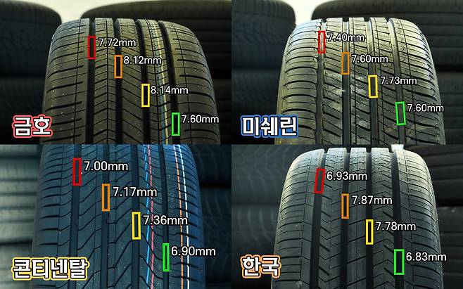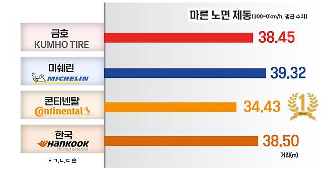 다음은 미쉐린, 이후 금호와 콘티넨탈이 유사 성능을 기록했다.