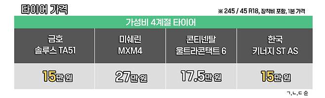 제품 가격도 비교했다. 우리가 시험한 규격은 245/45R18인데, 금호와 한국은 가격이 동일했다. 평균 14만 원대 후반에서 16만 원 내외다.