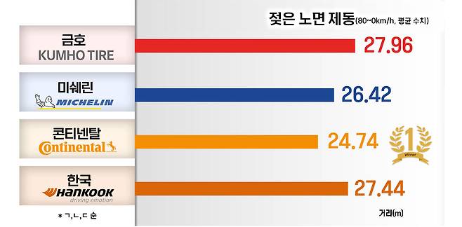 여기서도 가장 짧은 거리는 콘티넨탈 UC6가 기록했는데, 평균 24.7m 수준의 제동 거리 수준이었다. 2위 미쉐린과 비교해도 1.7m 가량 짧은 거리였으며 최장 거리를 낸 금호와 비교하면 3m 이상의 성능 차이였다.