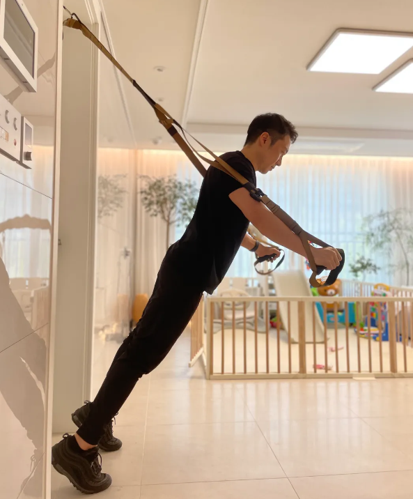 집에서 층간 소음 없이 할 수 있는 두 번째 운동은 TRX를 활용하는 것입니다. TRX는 기다란 끈으로 되어있는 운동 기구입니다. 줄과 연결되어 있는 스스로의 몸을 중량으로 활용하여 모든 부위의 근력 운동이 가능하게 만들어진 전신 저항 운동 기구입니다.