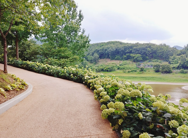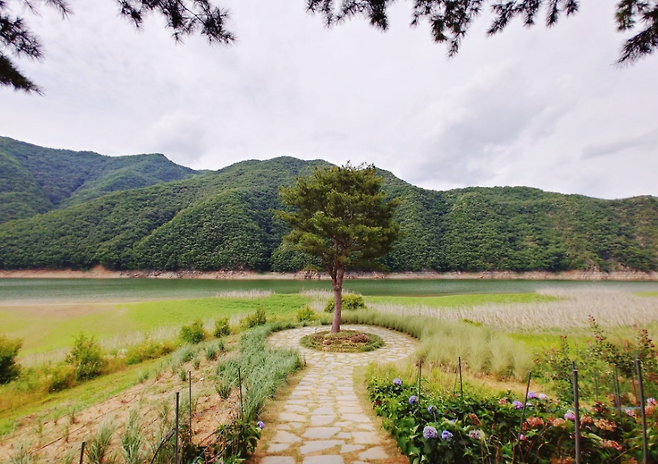 걷다 보면 유럽식 정원이 펼쳐지고대청호 전망이 한눈에 보이는 통창 카페도 자리하고 있어요.커피 한 잔과 함께 여유롭게 풍경을 즐기기에 딱 좋은 장소입니다.