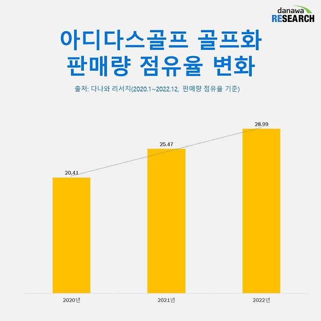 다나와에서 아디다스 골프의 판매량 점유율도 순조롭게 증가하고 있다. 다나와 리서치를 통해 지난 3년 동안의 아디다스 골프의 판매량 점유율을 확인한 결과, 2020년에는 전체 브랜드 중에서 20.41%를 차지했다. 그다음 해인 2021년에는 25.47%, 작년에는 28.99%를 기록했다.