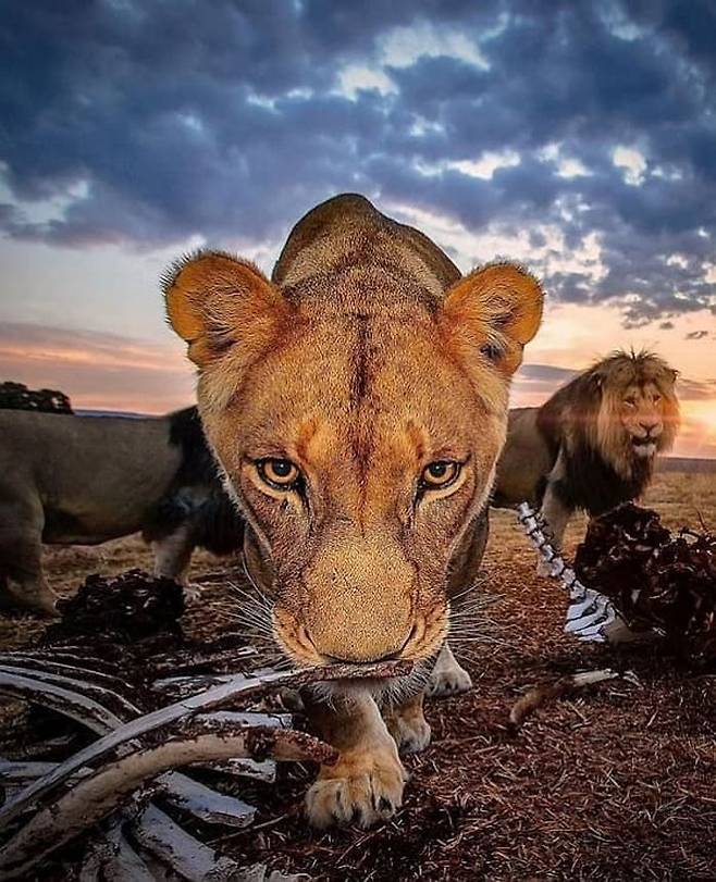 사자는 죽은 야생동물들의 뼈들이 가득한 언덕에서 홀로 무슨 생각을 하고 있는 것일까요. 혹시 약육강식의 세계에서 치열하게 싸워 살아남아야만 했던 지난날을 회상하고 있었던 것은 아니었을까.