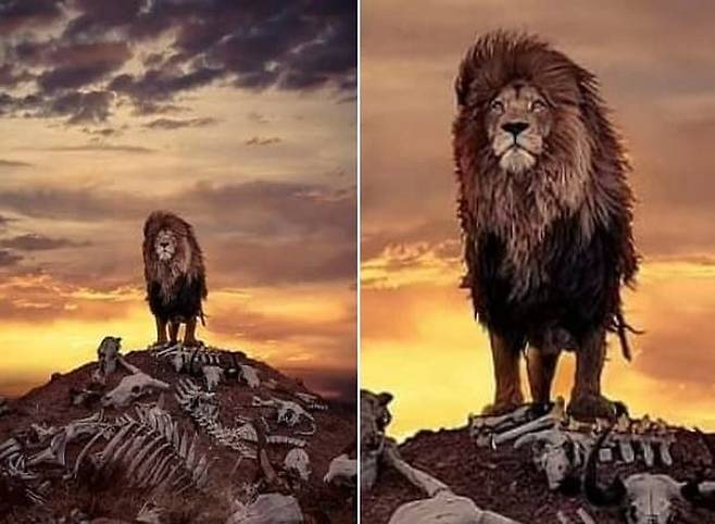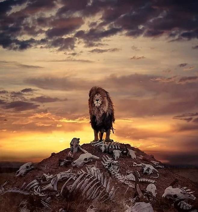 죽은 야생동물들의 뼈들이 수북하게 쌓여있는 언덕에서 사자 한마리가 위엄을 드러내며 꼭대기에 서있었죠.