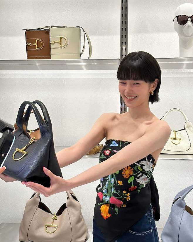 박규영이 명품 매장에서 플로럴 패턴의 튜브톱 스타일 의상을 선보이고 있다. 검은 바탕에 화려한 꽃무늬가 돋보이는 상의와 데님 팬츠의 조합으로 세련된 쇼핑 룩을 연출하고 있다. 특히 그녀가 들고 있는 골드 장식의 블랙 레더 핸드백은 고급스러움을 더하며, 매장에 진열된 다양한 컬러의 가방들과 조화를 이루고 있다.