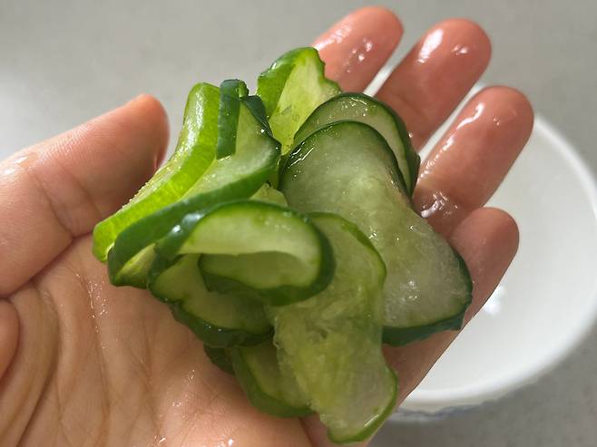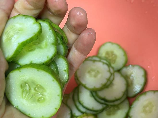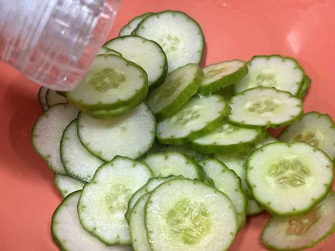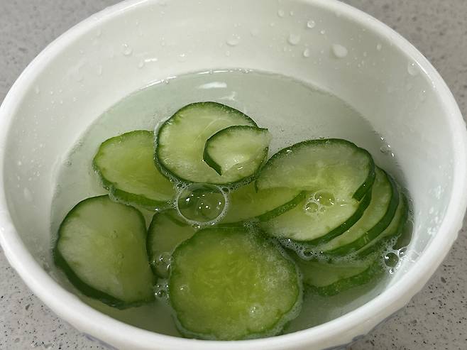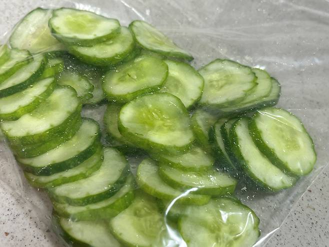 오이는 얇게 썰어서 준비하시고, 소금을 뿌려서 약 10분 동안 재워 놓습니다. 소금에 절이면 오이 속 수분이 빠지면서 냉동 후에도 덜 물러지고 아삭한 식감이 어느 정도 유지됩니다.