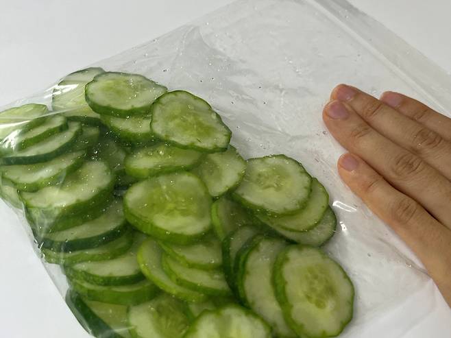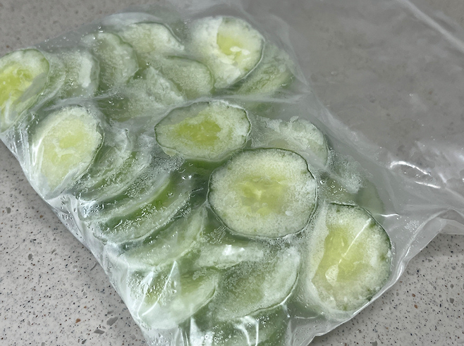 지퍼백에 공기를 최대한 빼고 꽉 잠가서 냉동실에 얼려 보세요. 특히 오이는 수분 함량이 많아 냉장고에 오래 두면 금방 물러지고, 곰팡이가 생기기 쉽습니다. 하지만 이렇게 하면 오히려 신선하게 드실 수 있습니다.