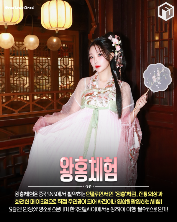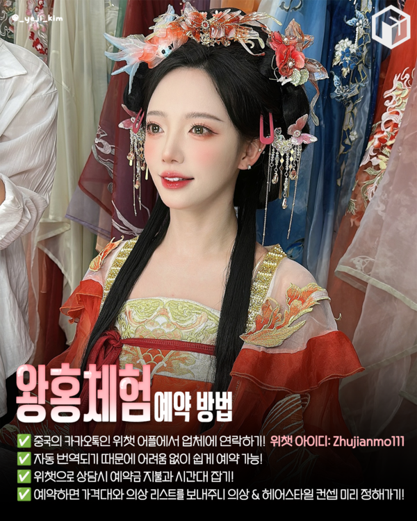 왕홍체험은 중국의 인기 인플루언서인 ‘왕홍’의 공주나 황후 콘셉트의 한푸(중국 전통 복식)를 입고 전문가의 손길로 메이크업과 헤어스타일링을 마친 뒤, 아름다운 세트장에서 사진 또는 영상을 촬영하는 체험입니다.