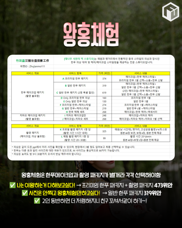 왕홍 체험은 의상 대여, 메이크업, 헤어스타일링, 촬영 여부 등에 따라 패키지가 다양합니다. 메이크업과 촬영은 별도라 따로 촬영을 원하지 않는 경우는 메이크업 패키지만 신청하셔도 가능하빈다.