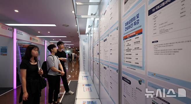 [서울=뉴시스] 김선웅 기자 = 18일 서울 강남구 건설회관에서 열린 대한건설협회 2025 스마트건설 청년인재 채용설명회에서 청년 구직자들이 채용공고 게시대를 살펴보고 있다.