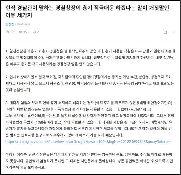 "현직 경찰관이 말하는 경찰청장이 흉기 적극 대응하겠다는 말이 거짓말인 이유 세 가지"라는 제목의 글을 쓴 이는 "일선 경찰관이 총기 사용시 경찰청은 절대 책임져주지 않는다"면서 "총기를 사용한 직원은 내부 감찰과 민형사 소송에 시달리고 범죄자에게 패가망신하게 된다"고 주장했다.