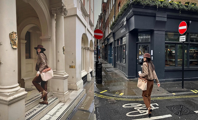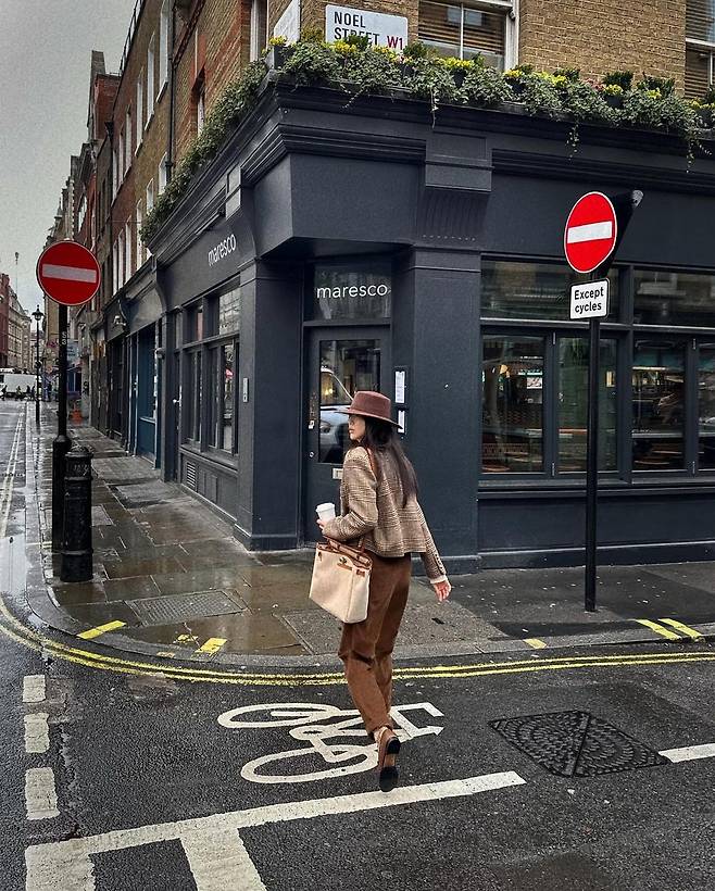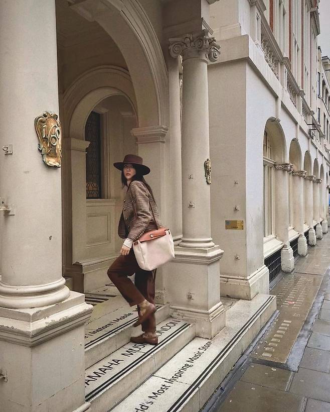 공개 된 사진 속 박하선은 베이지 컬러의 터틀넥 티를 이너로 입고 브라운 컬러의 체크 숏 자켓을 걸쳤다. 또한 브라운 컬러의 코듀로이 팬츠를 입고 클래식한 스타일링을 자랑했다. 창이 큰 브라운 컬러의 모자와 로퍼를 신어 가을 무드를 자랑하며 명품 브랜드의 백을 매치하여 럭셔리하며 고급스러운 분위기를 자랑했다.