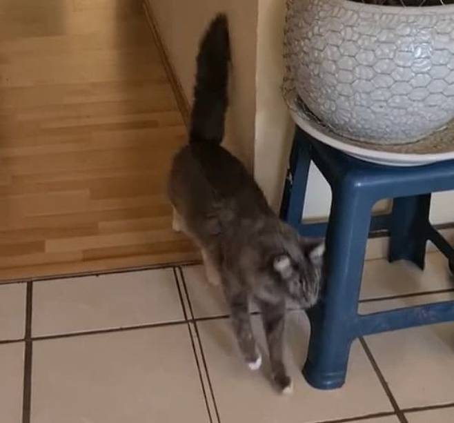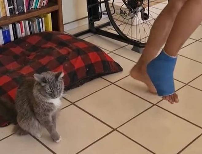 다리 다쳐서 제대로 걷지 못하는 집사를 놀리기라도 하려는 듯 집사의 걸음걸이를 똑같이 행동하는 고양이가 있어 웃음을 자아내게 합니다.