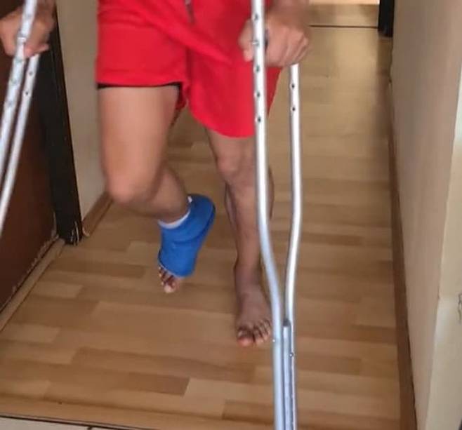 무슨 이유 때문인지 알 수는 없지만 다리가 다쳐서 깁스를 하고 있는 집사가 있습니다. 다리에 깁스한 탓에 목발을 짚고 다닐 수밖에 없는 상황.