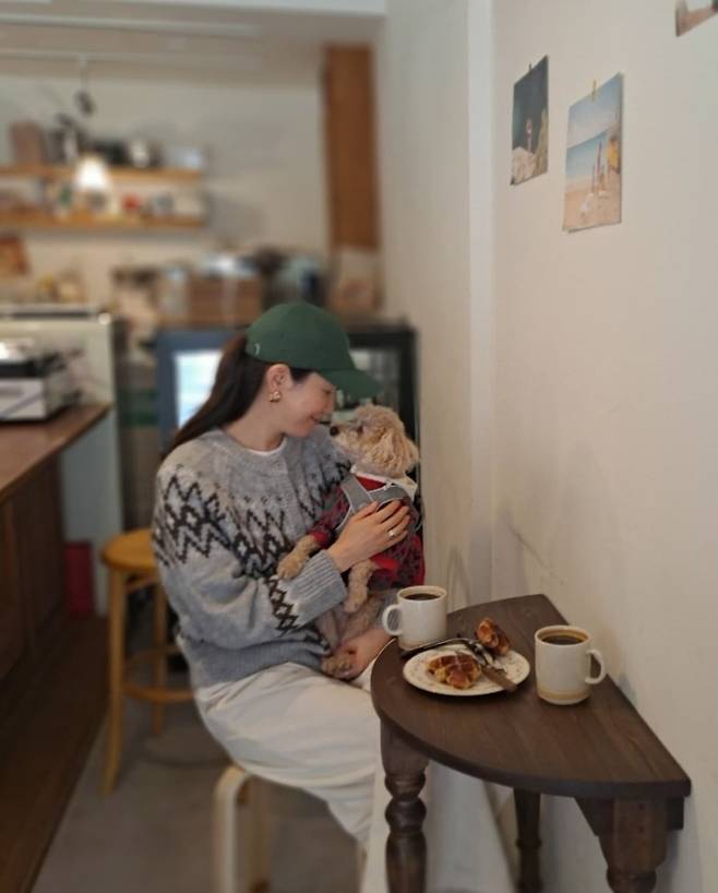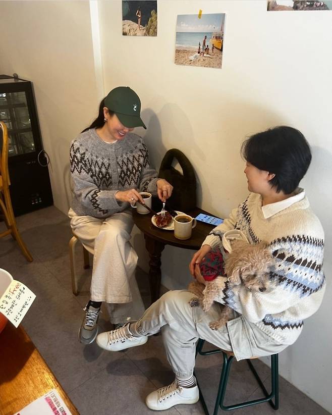 이태란의 언니 역시 동일한 디자인의 노르딕 니트를 다른 컬러로 선택해 자연스럽게 조화를 이루었으며, 귀여운 강아지까지 함께해 훈훈한 가족의 모습을 연출했습니다.