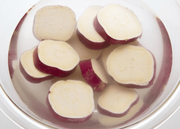 그런 다음 고구마는 2cm 정도의 두께로 썰어주는데, 너무 얇게 자르면 부서지기 쉽고, 너무 두껍게 썰면 익는 시간이 길어져 겉은 타고 속은 덜 익는 결과를 초래할 수 있다. 따라서 일정한 두께로 자르는 것이 핵심이다.