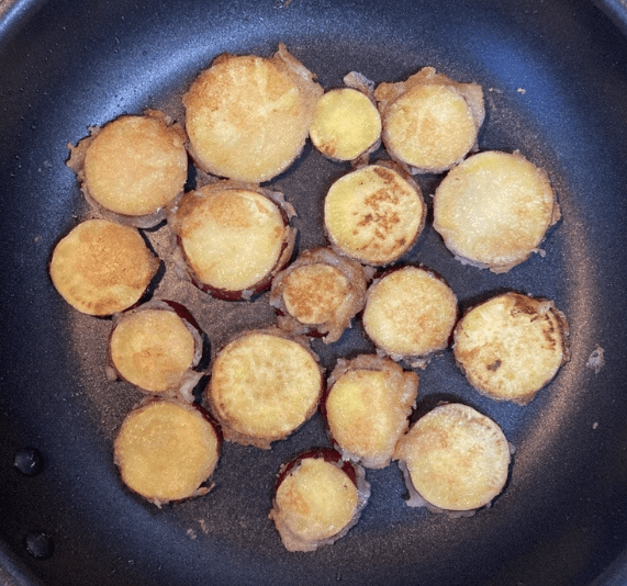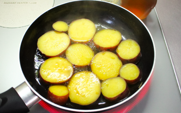 고구마를 팬에 올린 후에는 중약불에서 천천히 앞뒤로 노릇하게 익혀주는 과정이 중요하다. 겉면의 반죽이 바삭하게 익을 때까지 한쪽 면을 3~4분 정도 굽고, 뒤집어서 반대쪽도 동일하게 굽는다.