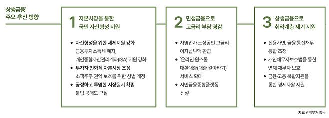 이에 따라 금융투자소득세(금투세)는 폐지하고 개인종합자산관리계좌(ISA)의 납입한도는 늘리는 등 주식 세제 정비에 착수합니다. 또 자영업자·소상공인의 이자부담을 덜어주기 위한 방안을 본격 추진하고 아울러 취약계층이 다시 일어설 수 있도록 신용사면 등을 통해 신용회복을 지원하기로 했습니다.