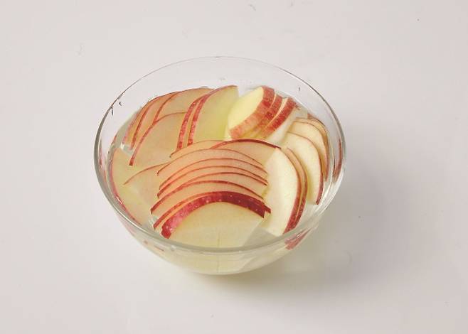 2. 납작 썬 사과는 갈변되지 않도록 설탕(2T)을 섞은 물(1컵)에 담가둔다.