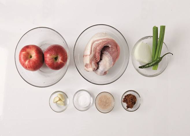 주재료 : 사과(2개), 양파(1/2개), 마늘(3쪽), 대파 푸른 부분(2대), 통삼겹살(600g)