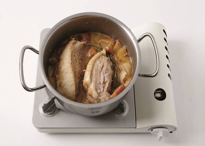 4. 통삼겹살을 2등분해 올리고 된장을 넣어 끓어오르면 뚜껑을 덮어 중약 불로 1시간 동안 찌듯이 익힌다.